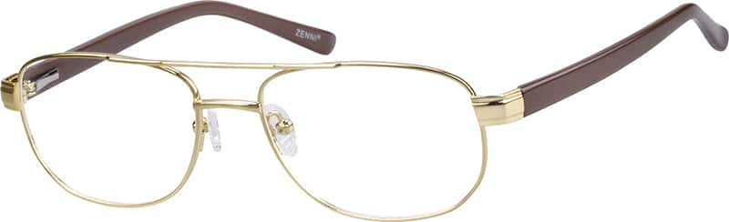 Durable spring-action temples for lasting, pressure-free comfort.It's the classic full-rim aviator ("aviator" means a double bar on the bridge) Men's eyeglasses frame with a two-tone twist. The metal alloy front has contrasting-color acetate, spring-hinged temple arms, updating an old reliable frame with a shot of style. Adjustable silicone nose pads provide extra comfort.