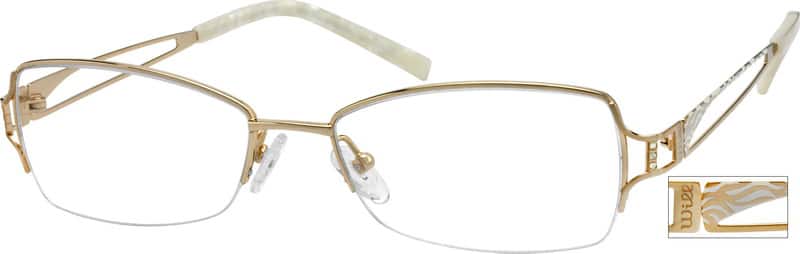 Durable spring-action temples for lasting, pressure-free comfort.A stylish titanium half-rim frame with rhinestones on the front corners of the frame and a split temple arm design.