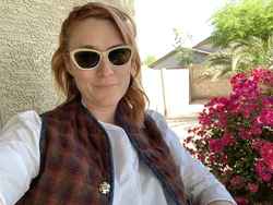 4 years agoThese frames have a unique shape, they aren’t too wide, and they have a glittery finish. They look great as sunglasses and I’m about to try the photochromatic for my new prescription. All my pics are with my dog — we’ll see if they get included with my review.