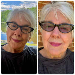 I’m very happy with these. So comfortable. The optometrist advised me to always wear sunglasses outside so I got the basic photochromic lens for my bifocals to avoid having to fuss with clip-on sunglasses while walking to nearby stores to shop. These take a while to lighten up indoors, but the lens height makes it easy to peer over the top until they adjust. The try-on feature is not working as well as it used to for me, so I wasn’t able to use it this time. I’ve had similar frames before so I took a chance. Not sure they’re my best look, but at the price it’s possible to have a couple of pairs for different purposes.